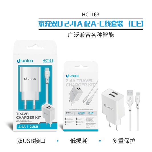 Home Charger Dual U 2.4A with A-C Cable Set (CE)(UNICO,HC1163,White,2USB)