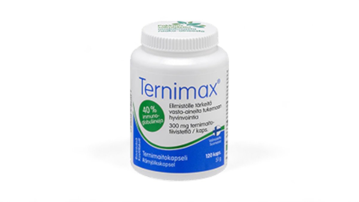 Vahva kapselimuotoinen valmiste, sisältää 300 mg ternimaitotiivistettä/kapseli, josta 40 % eli 120 mg immunoglobuliineja (vasta-aineita)