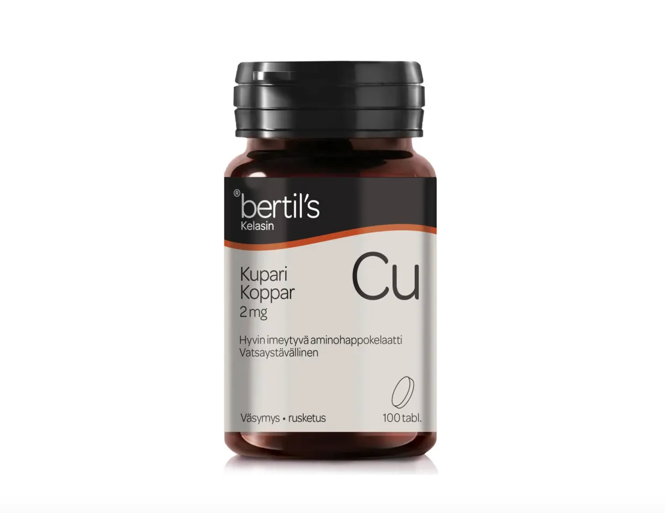 Bertil's Kelasin Kupari -tabletit sisältävät kupariaminohappokelaattia, joka on parhaiten imeytyvä kuparin muoto. Ei ärsytä vatsaa.