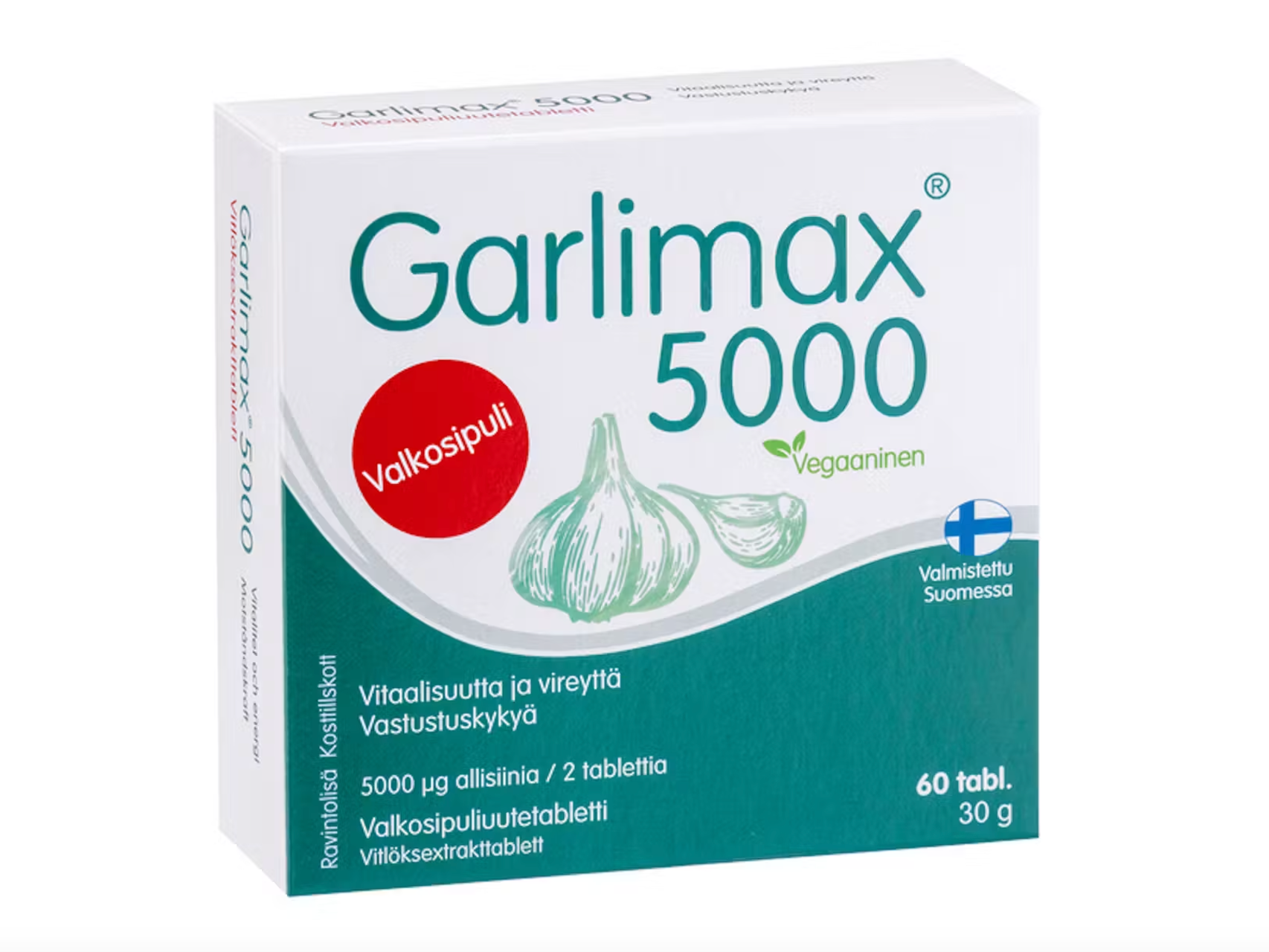 Valkosipuli (Allium sativum) tukee normaalia vastustuskykyä ja verenkiertoa. Sillä on suotuisia vaikutuksia myös hengityselimistölle, kolesterolin hallintaan sekä maksalle. Garlimax®-valkosipuliuutetabletit sisältävät biologisesti aktiivista valkosipuliuutetta, jonka allisiinipitoisuus on vakioitu. Yksi tabletti sisältää 2500 µg allisiinia. Tuote sopii kaikenikäisille päivittäiseen käyttöön tukemaan vastustuskykyä ja jaksamista arjessa. Annostus: 1-2 tablettia päivässä. Laktoositon, gluteeniton, hiivaton ja makeuttamaton. Valmistettu Suomessa.