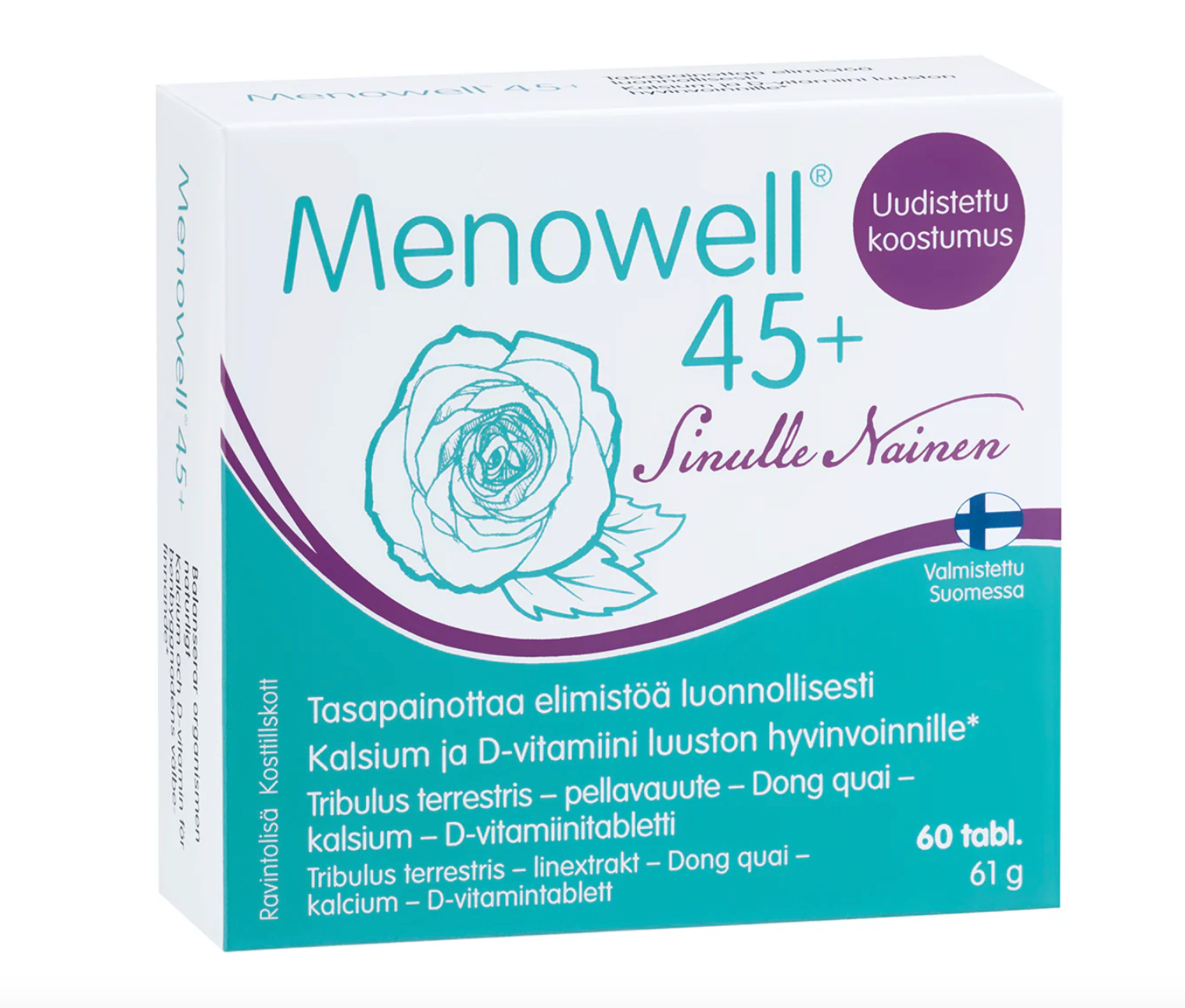 - Menowell 45+ sisältää kolmea naisen hormonitoimintoja tasapainottavaa ja jokapäiväistä elämää helpottavaa kasviperäistä vaikuttavaa ainetta, joiden avulla kuukaudet ja vuodet kuluvat tasaisemmin.