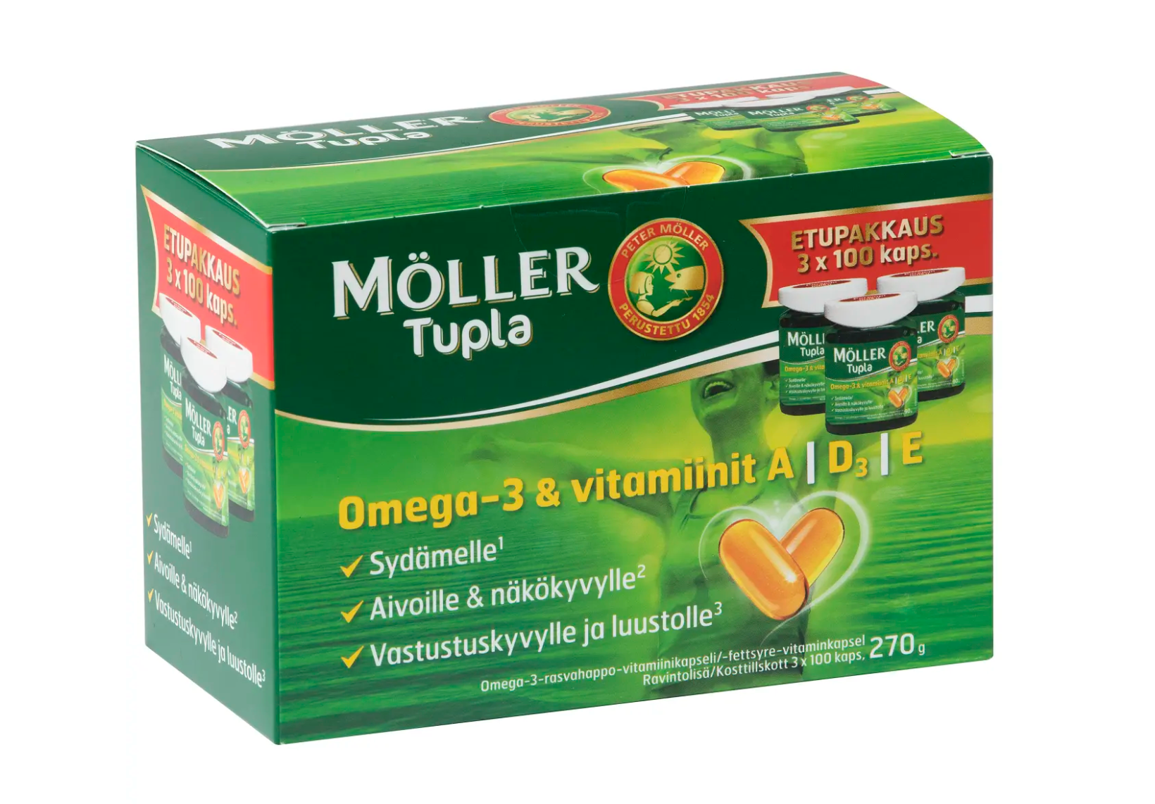 Möller Tupla on soijaton kalaöljyvalmiste ja ravintolisä, joka sisältää elimistölle tärkeitä omega-3-rasvahappoja sekä A-, D- ja E-vitamiinia. Tuotteen sisältämät EPA ja DHA -rasvahapot tukevat sydämen kuntoa. Näiden lisäksi valmisteen sisältämä E-vitamiini suojaa soluja sekä D- ja A-vitamiini ylläpitävät vastustuskykyä