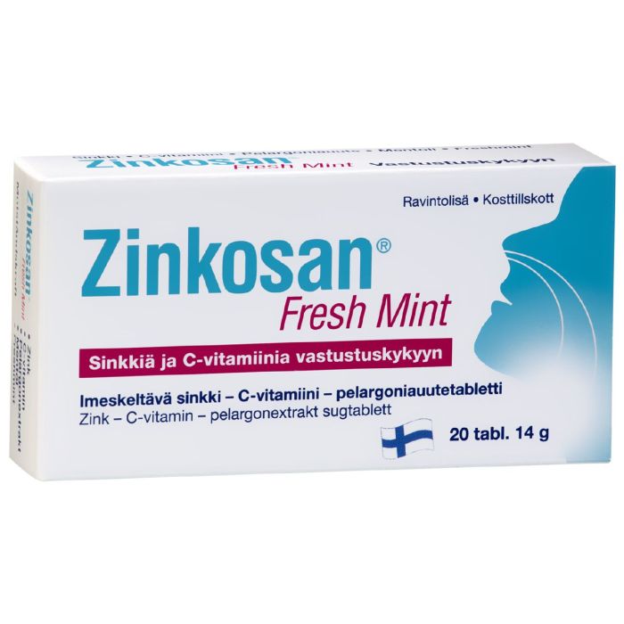 Zinkosan Fresh Mint on imeskeltävä tabletti kurkun karheuteen ja avaamaan tukkoista hengitystä. Tehoaineina ovat sinkki, C-vitamiini ja pelargoniauute, jotka yhdessä tehostavat elimistön vastustuskykyä. Mentoli ja freshmint-aromi tuovat raikkaan olon hengitysteihin. Annostus: 1 tabletti 4 kertaa päivässä. Tablettien annetaan liueta hitaasti suussa. Laktoositon, hiivaton, gluteeniton. Valmistettu Suomessa.