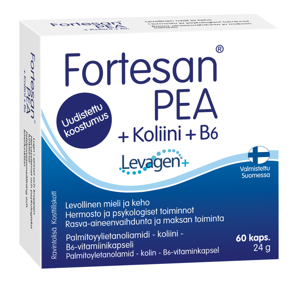 Fortesan® PEA + Koliini + B6 -ravintolisä sisältää patentoitua Levagen®+ palmitoyylietanoliamidia sekä sen vaikutusta täydentäviä koliinia ja B6-vitamiinia. Palmitoyylietanoliamidi eli PEA on rasvahappoamidi, jota keho tuottaa itse esimerkiksi urheillessa, tukien samalla suorituksesta palautumista. Se myös rentouttaa ja vaikuttaa positiivisesti unen laatuun. Ei sisällä eläinperäisiä ainesosia. Valmistettu Suomessa.